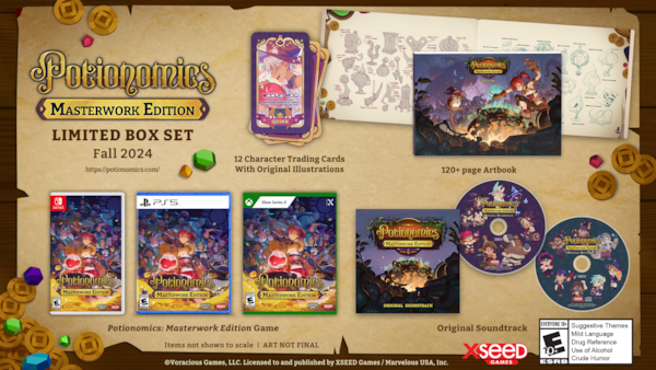 Developed by Voracious Games and published by XSEED Games, Potionomics was released on Windows PC via Steam on Oct. 17, 2022. The free patch adding new features to the PC version and the “Boss Finn Content Pack” DLC priced at $4.99 were released on Oct. 22, 2024. Potionomics: Masterwork Edition released on Oct. 22, 2024 for the PS5™, Xbox Series X|S, and Nintendo Switch™ system and is available in a Limited Box Set physical release, which includes a copy of the game, a 120+ page art book, a two-disc soundtrack, and 12 character trading cards with original illustrations, for an MSRP of $49.99 through the Marvelous USA Online Store and select retailers. The standalone base game is available digitally on the Nintendo eShop for Nintendo Switch, Xbox Series X|S, and PlayStation®5 for $29.99. The title is published on Nintendo Switch, Xbox Series X|S, and PlayStation®5 in Europe by Marvelous Europe. This title has been rated “E10+” by the ESRB.