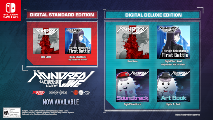 The Hundred Line -Last Defense Academy- is published globally by Aniplex Inc. on Windows PC via Steam and is available in a standard edition for $59.99/€59.99 and a Digital Deluxe edition including a copy of the game, digital art book, and digital soundtrack for $69.99/€69.99, and digitally on the Nintendo eShop for Nintendo Switch in Europe for €59.99 and €69.99, respectively.