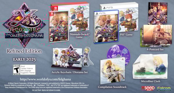 Ys Memoire: The Oath in Felghana is developed by Nihon Falcom and published in the Americas on the Nintendo Switch™ system, PS5™, and PS4™ by XSEED Games, and launched Jan. 7, 2025. A limited Ys Memoire: The Oath in Felghana “Refined Edition” physical release is available for purchase at participating retailers and on the Marvelous USA Online Store for the Nintendo Switch™ and PlayStation®5. The Refined Edition includes a copy of the game packaged with a soundtrack CD featuring 14 songs, an acrylic diorama/keychain set, a set of four postcards featuring art from the game, and a graphic cleaner cloth for an MSRP of $59.99. Ys Memoire: The Oath in Felghana is published in Europe by Marvelous Europe. For more information about the game, visit the official site at worldofys.com/felghana. This title has been rated “T for Teen” by the ESRB.